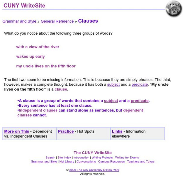 This page, from a site for University of Oregon journalism students, provides definitions of a clause, an independent clause, and a dependent clause as well as some brief instructions on their uses. The page seems to contain some...