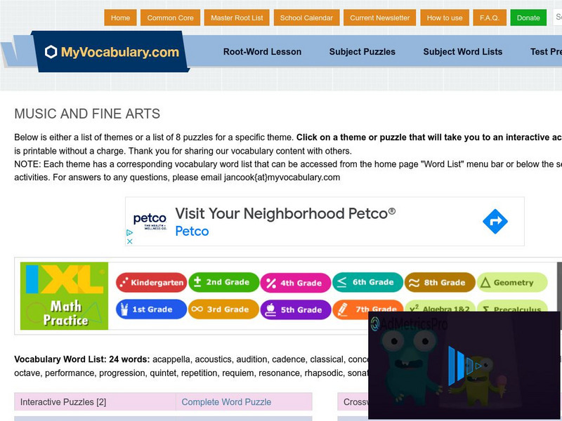 This page has a variety of vocabulary puzzles and activities using 24 vocabulary words pertaining to Music and Fine Arts. It also offers an extensive vocabulary word list for music, a list of musical instruments, and lesson questions.