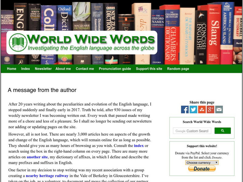 "World Wide Words is devoted to the English language - its history, quirks, curiosities and evolution. The Words site is organized into sections, each with its own index to help you find your way about."