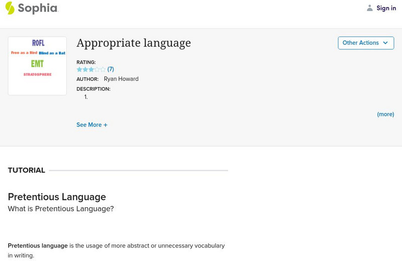 Students can learn how to use language appropriately through these notes on pretentious language, nine presentation slides on using jargon, eleven presentation slides on cliches in writing, and a video also about cliches. [2:00]