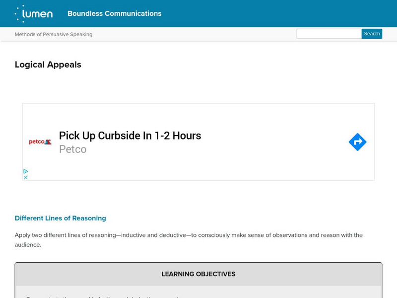This lesson focuses on using logical appeals in persuasive speeches including inductive and deductive reasoning, inductive reasoning and associative reasoning, forming a rational appeal, and errors in reasoning-formal and informal.