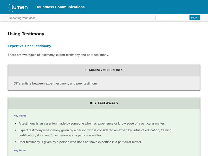 This lesson focuses on the use of testimony in a speech including the difference between peer and expert testimony, questions to consider before using testimony, how to incorporate expert testimony, and an example of incorporating expert...