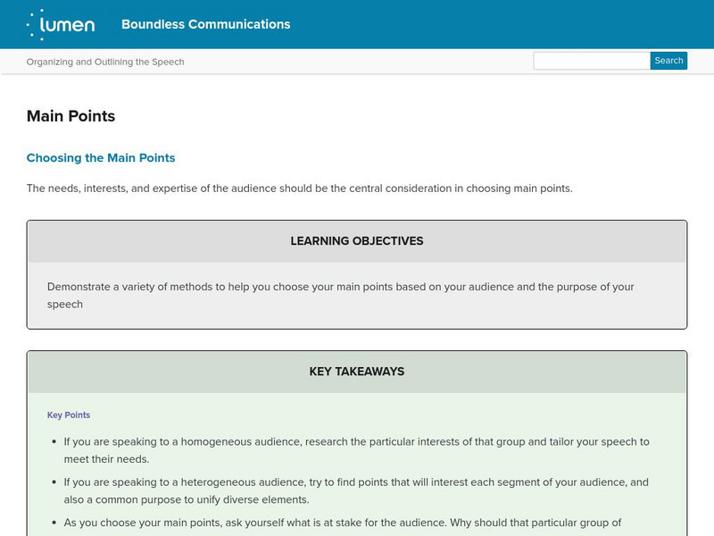 This lesson focuses on choosing the main points of your speech based on your audience and purpose. It also discusses ordering and highlighting your main points using visual and textual cues and using a variety of examples.