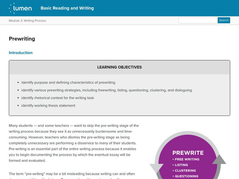 This lesson focuses on prewriting including the purpose and characteristics of prewriting, prewriting strategies, the rhetorical context, and developing a working thesis statement. It also includes a slide show about author, audience,...
