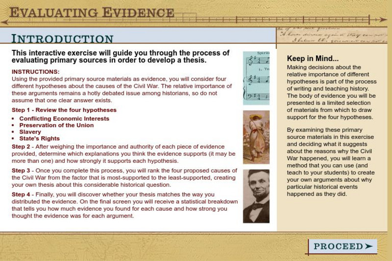Use this interactive lesson to practice evaluating evidence from primary sources in order to draw conclusions about a historical event. In this particular case, the event is the Civil War. The challenge is to decide for yourself which of...