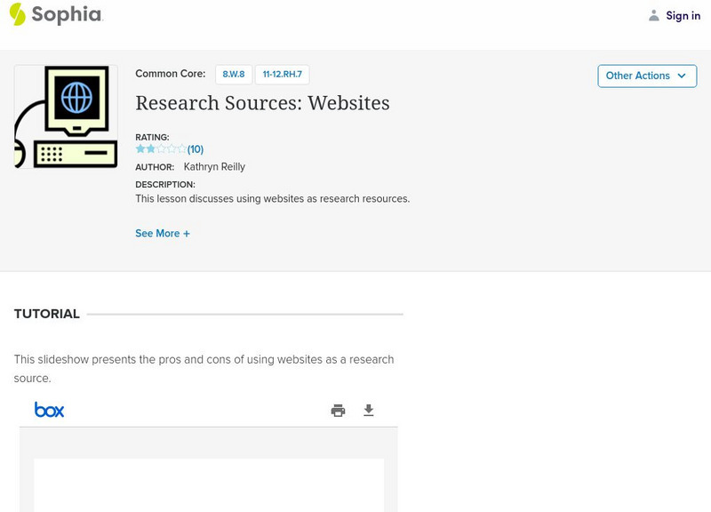 This slideshow lesson focuses on the use of websites for research sources. It gives the pros and cons to using websites as sources and discusses the need to evaluate websites and what to look for.