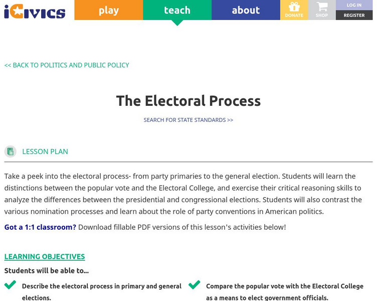 Take a peek into the electoral process from party primaries to the general election. Students will learn the distinctions between the popular vote and the Electoral College, and exercise their critical reasoning skills to analyze the...