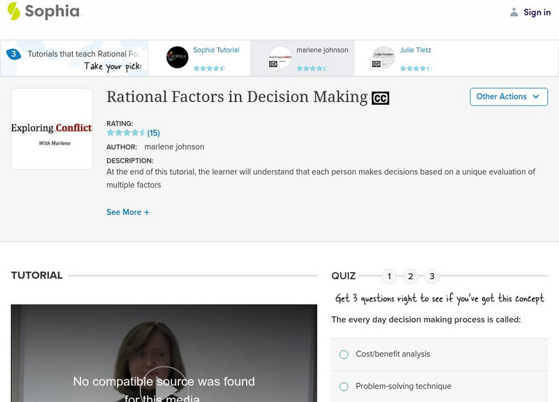 At the end of this tutorial, the learner will understand that each person makes decisions based on a unique evaluation of multiple factors. It is 2 of 3 in the series titled "Rational Factors in Decision Making:."