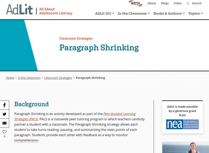 Paragraph Shrinking is an activity developed as part of the Peer-Assisted Learning Strategies (PALS). PALS is a classwide peer tutoring program in which teachers carefully partner a student with a classmate. The Paragraph Shrinking...