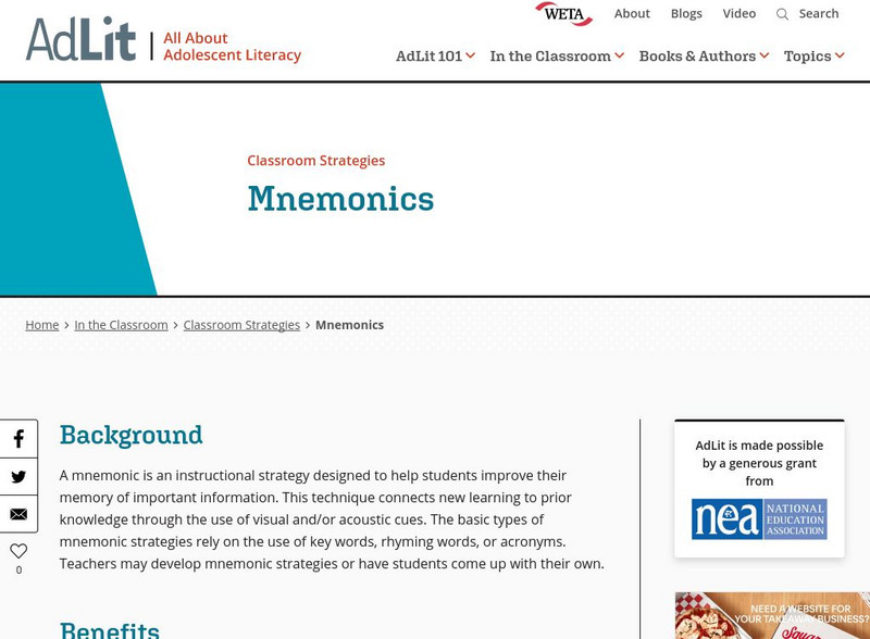 A mnemonic is an instructional strategy designed to help students improve their memory of important information. This technique connects new learning to prior knowledge through the use of visual and/or acoustic cues. The basic types of...