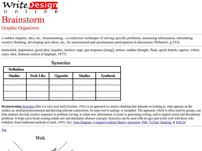 Lists and describes several types of graphic organizers which fall under the "brainstorming" mold, including synectics, webs, cerebral charts, and network trees.