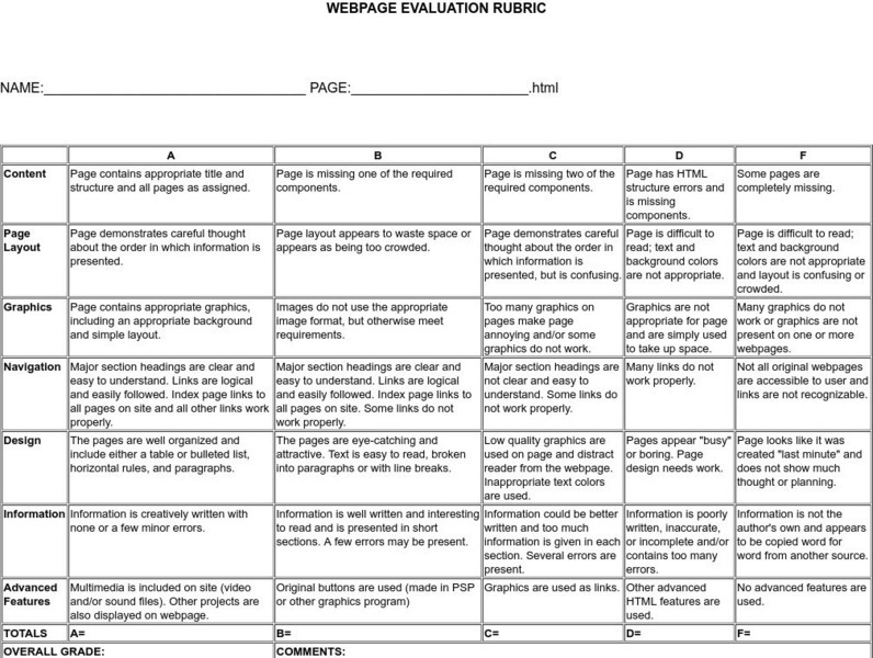 This is a good example of an evaluation rubric for a student created web page. Categories include content, page layout, graphics, navigation, design, information, and advanced features.