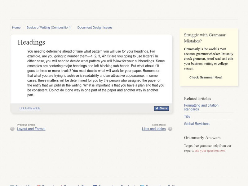 This page focuses on the use of headings in a paper. The layout of the headings and subheadings should be determined before beginning the paper to make it easier to read and more attractive. Most important is to be consistent with...