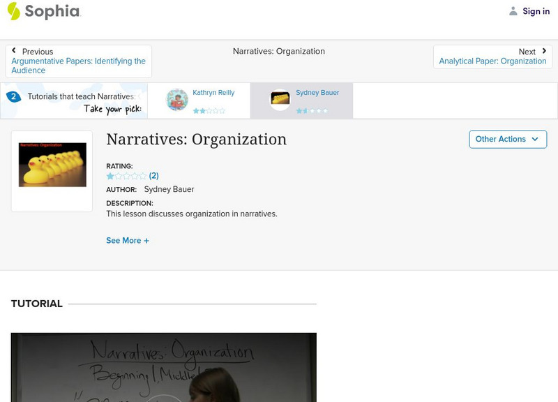 This video tutorial discusses how narratives are organized including beginning, middle, end and types of organizational patterns. It is 1 of 2 in the series titled "Narratives: Organization." [10:06] W.11-12.3c Narrative Org