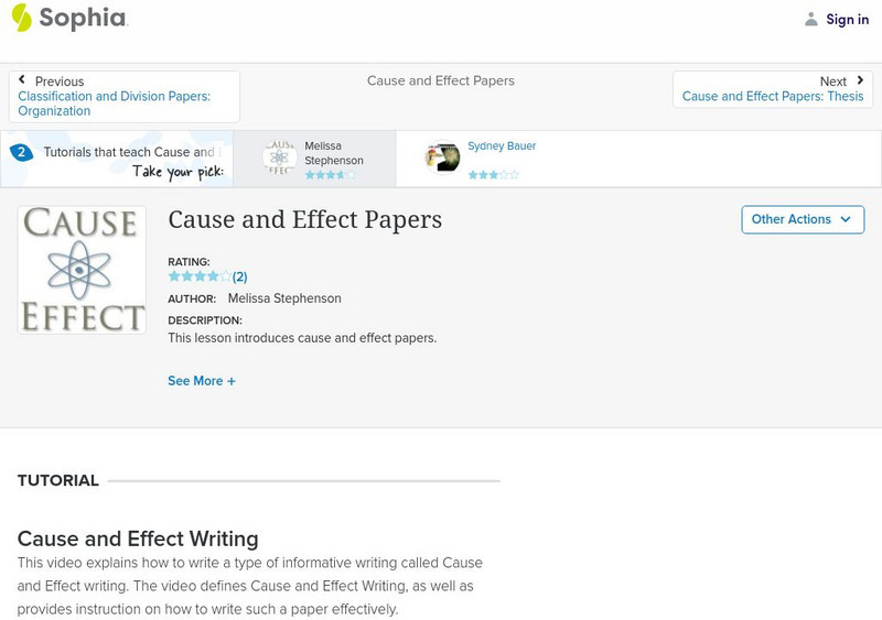 This video lesson focuses on cause and effect papers. It begins by defining the terms and purpose for cause and effect writing and then moves on to planning, organizing, and writing the paper. Real Player is required.