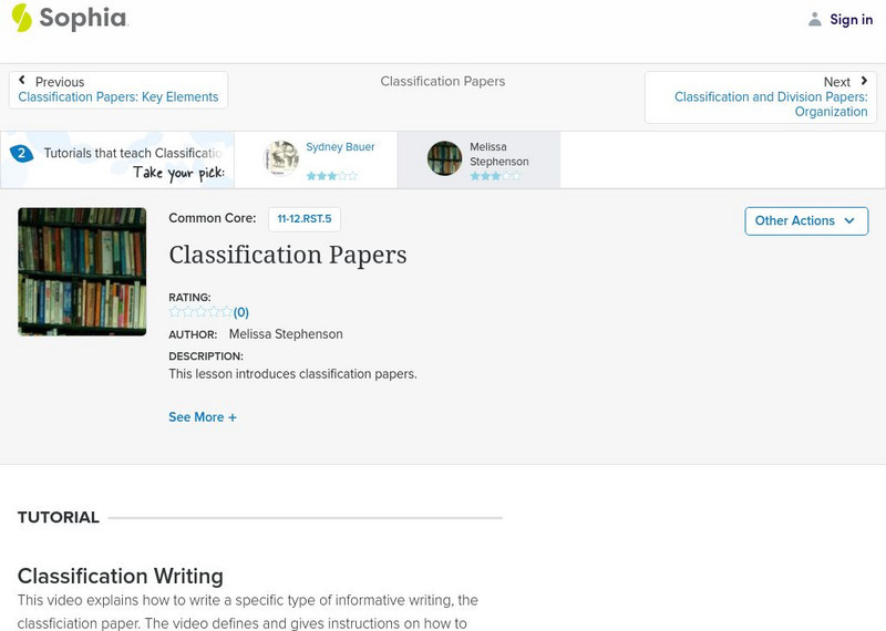 This video tutorial focuses on a type of informative writing called classification papers. It defines classification writing, provides an organization pattern for the material, and offers a general outline for classification papers.