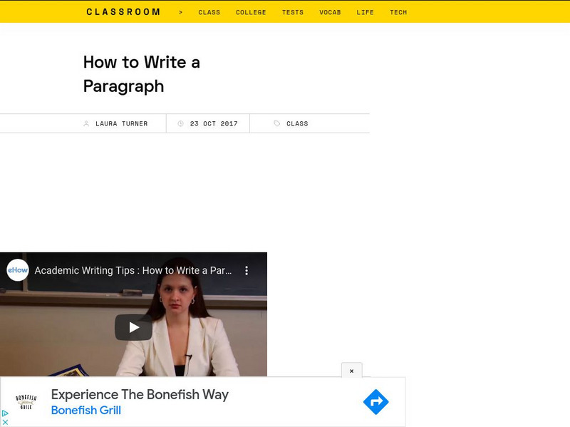 In this video Laura Turner explains how to write a paragraph; like a mini essay it requires a single subject and include an introduction sentence, a body, and a closing sentence. [1:08]
