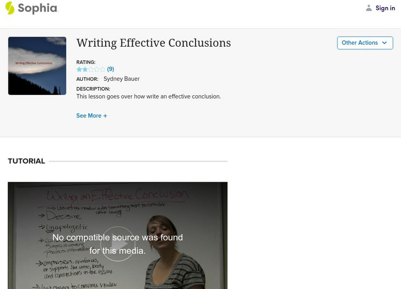 This video lesson focuses on writing conclusions, i.e., what makes an effective conclusion, what to include in a conclusion, and how to write one. [7:44] W.9-10.1e, W.9-10.3e Conclusion, W.11-12.1e Argument Conclusion, W.11-12.2f...