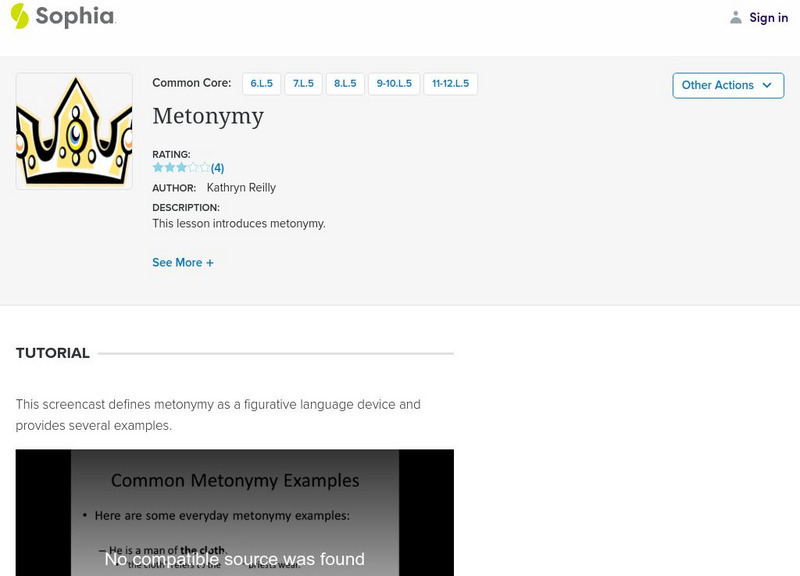 This lesson focuses on the literary device metonymy; it defines it, compares it to a metaphor, and provides everyday examples such as "man of the cloth" for priest, and literary examples such as "lend me your ears."