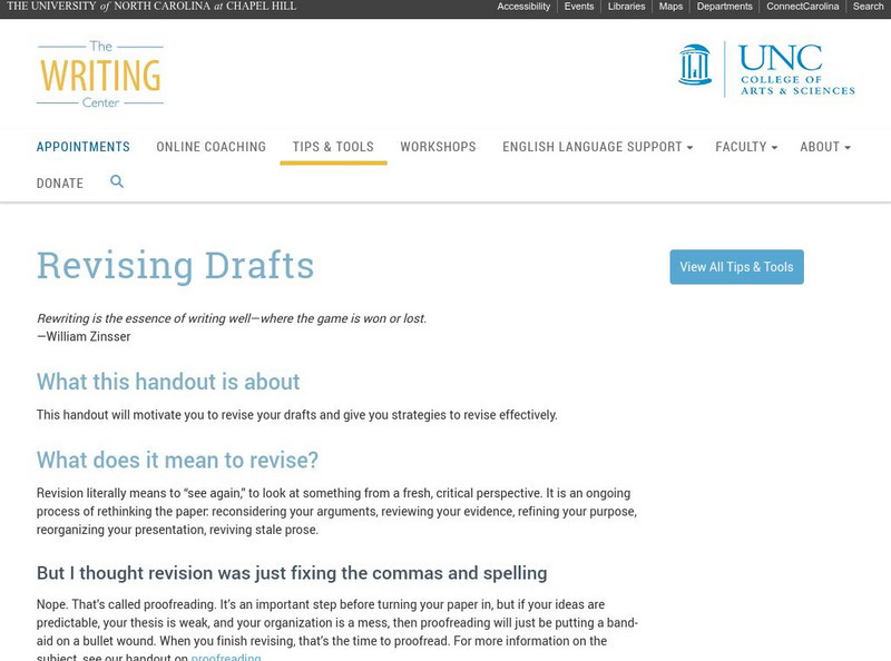 This site examines all aspects of the rewriting process. Includes advice on how to use computers during the process, comments on peer editing, links to related topics, and an editing checklist.