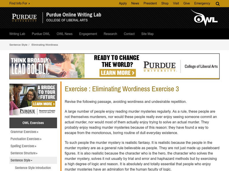 This Purdue University OWL (Online Writing Lab) provides practice with revising writing by having students read and revise a passage to reduce redundancy and wordiness.