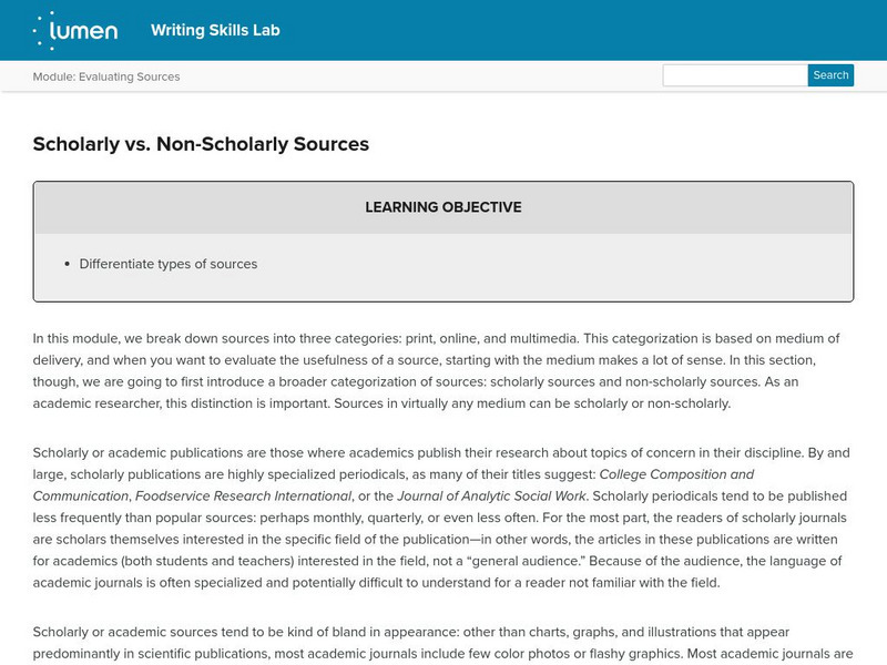 Lumen: Evaluating Sources: Scholarly vs. Non Scholarly Sources