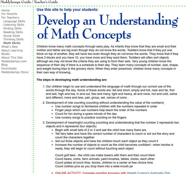 Thirteen steps in developing math understanding is provided by Susan Jindrich, who has contributed to the creation of Chateau Meddybemps.