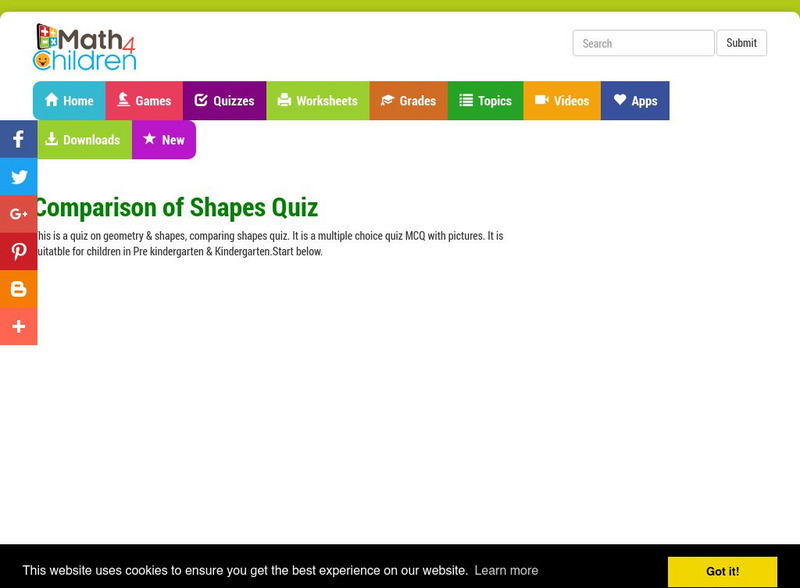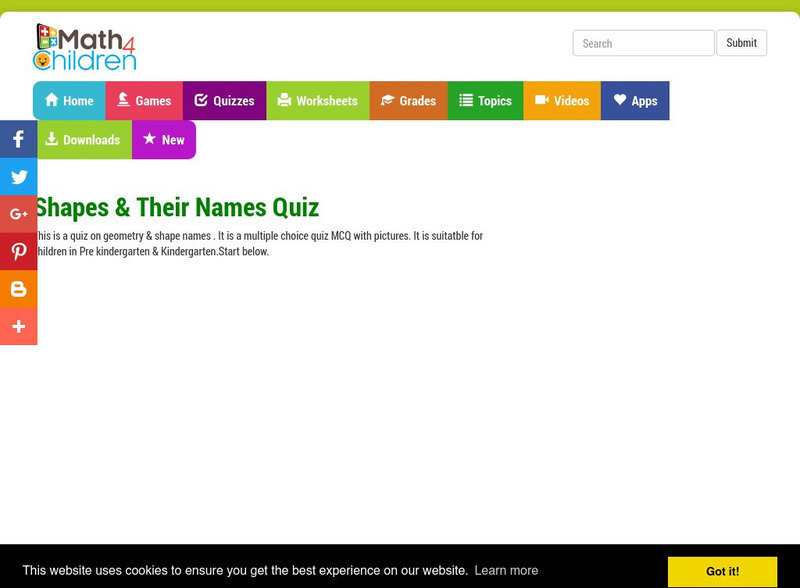 Children look at a given object and compare it with the name of the shape that matches the object. Links to other quizzes and games are provided. PDF (Adobe Reader is required).