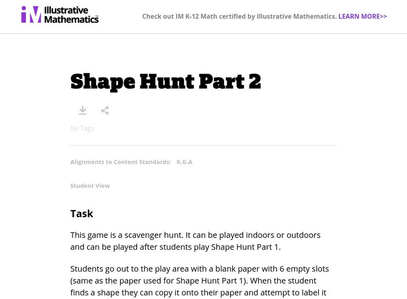 The objective of this game is for students to find and identify shapes by going on a scavenger hunt. Students go to the assigned area with a blank paper with 6 empty slots. When the student finds a shape they can copy it onto their paper...