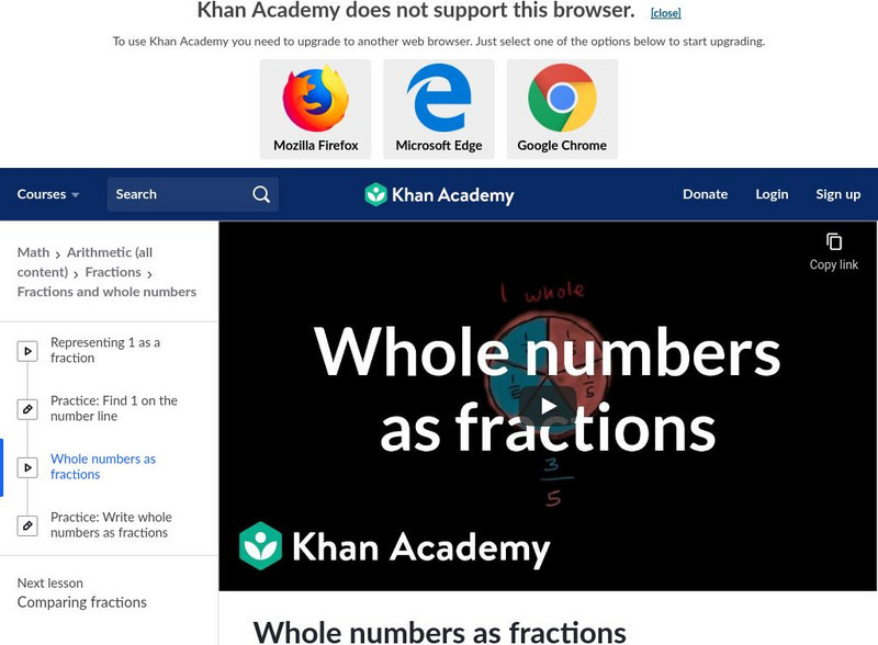 Shows how the number 3 can be represented as a fraction using fraction models and a number line. [4:23] CCSS.Math.Content.3.NF.A.3.c Express whole numbers as fractions, and recognize fractions that are equivalent to whole numbers.