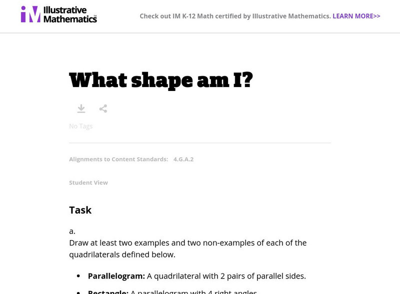 The purpose of this task is for students to articulate a definition for a trapezoid. Aligns with 4.G.A.2.