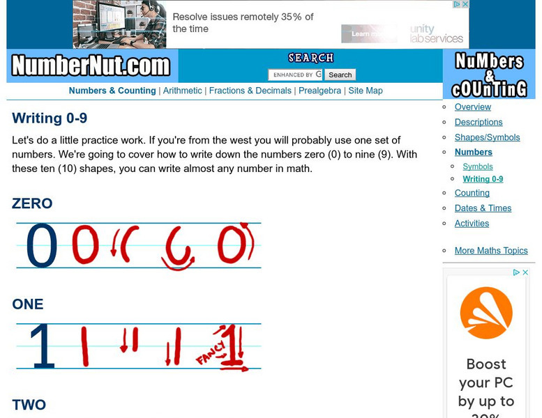 Explains how to write the numbers from zero to nine using correct penmanship.