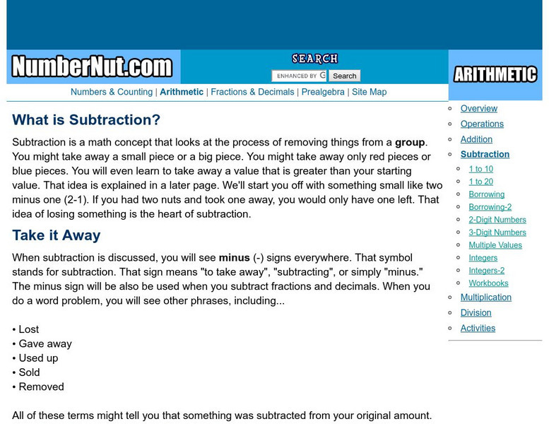 Get an overview of the subtraction process in this brief lesson that introduces key concepts, vocabulary, and symbols. Links to related, interactive practice are also available in this lesson.