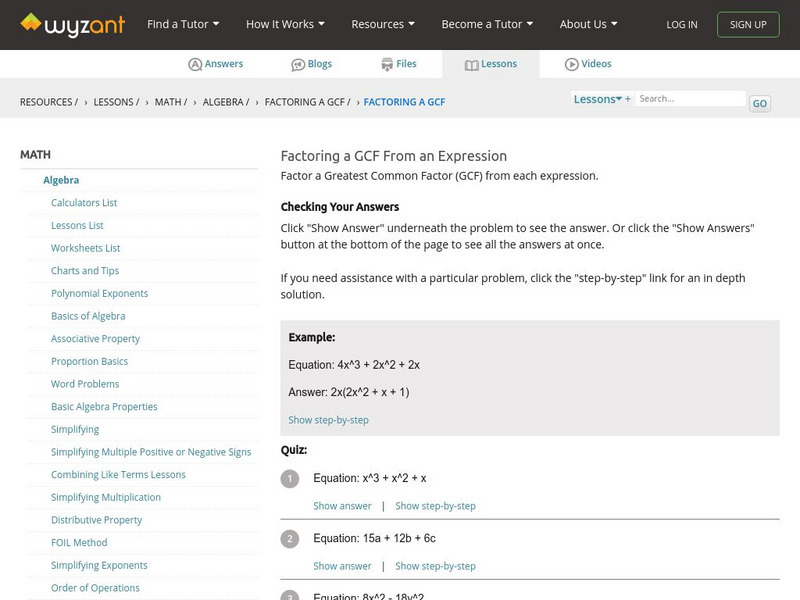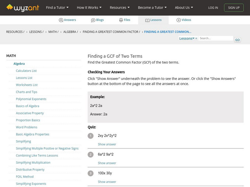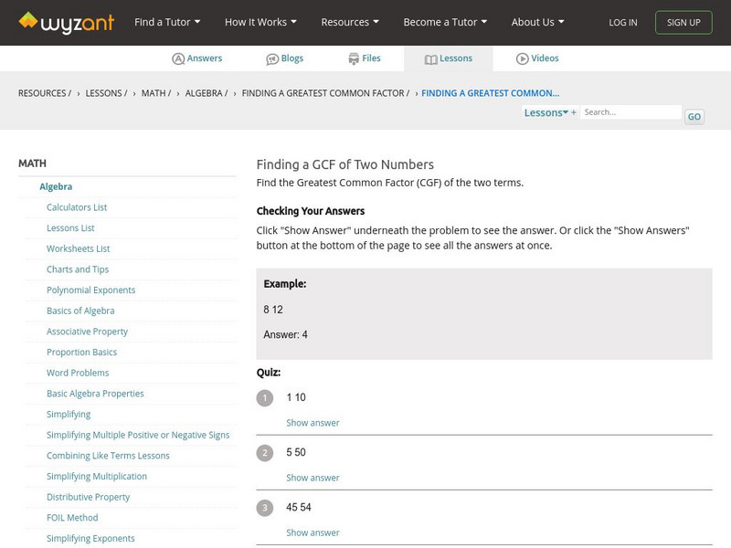 In this lesson from WyzAnt, students learn how to find the greatest common factor (GCF) for numbers and expressions. There are practice problems and a GCF calculator for assistance.