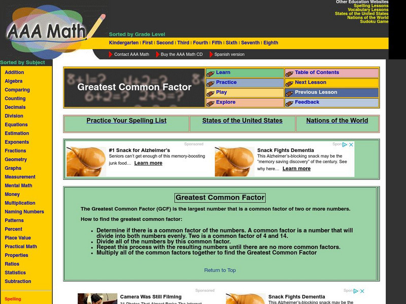 This lesson contains a learning exercise in which the user has to find the greatest common factor and type it in. The exercise keeps track of how many right and wrong answers given and gives you a grade.
