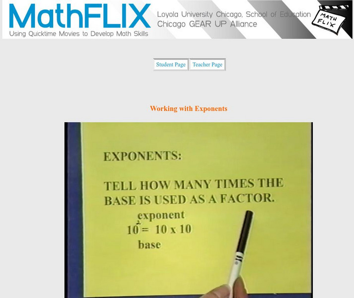 This QuickTime movie provides an introduction to exponents. As you watch and listen to the teacher and students interact it helps clarify the thinking behind applying this concept.