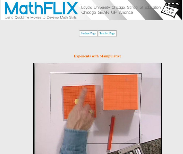 This QuickTime movie provides an opportunity to understand the use of exponents through manipulatives. As you watch and listen to the teacher and students interact it helps clarify the thinking behind applying this concept.