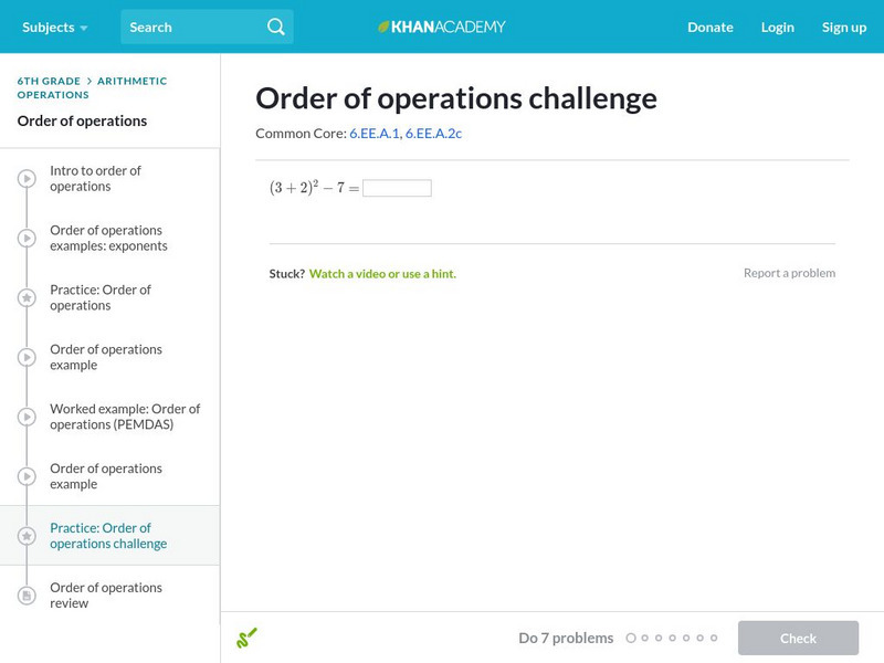 Practice solving more challenging problems using the order of operations. Students receive immediate feedback and have the opportunity to try questions repeatedly, watch a video or receive hints.