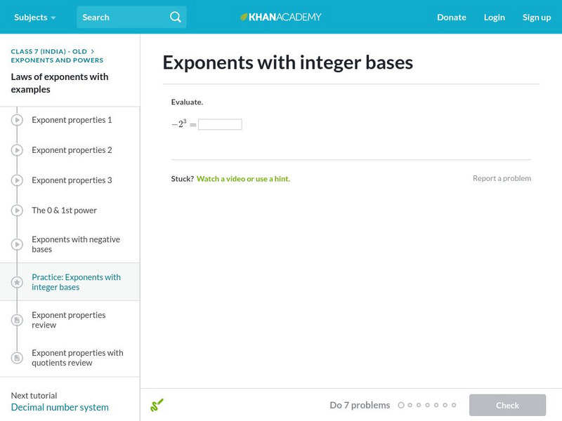 In this exercise, students practice finding whole number exponents with integer bases. Students receive immediate feedback and have the opportunity to get hints and try questions repeatedly.