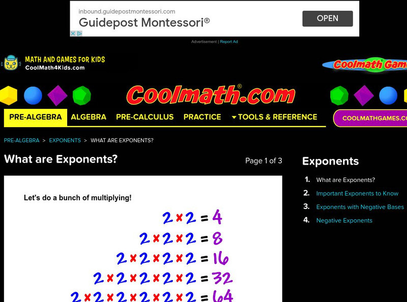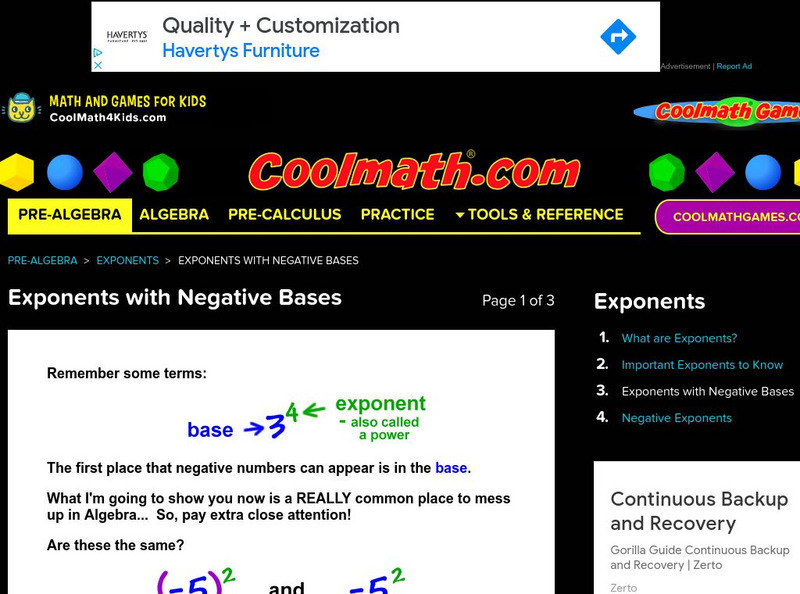 This site explains how to evaluate exponents of positive and negative numbers. The site provides games and exercises to practice the skill.
