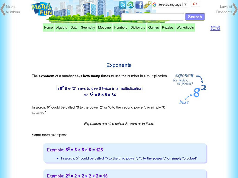 The learning activity examines exponents. The resource consists of explanations, examples with solutions, and practice problems