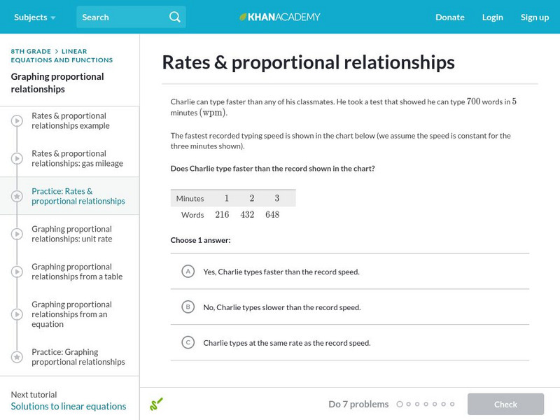 A variety of questions about rates and proportional relationships involving graphs, tables, and equations. Students receive immediate feedback and have the opportunity to try questions repeatedly, watch a video, or receive hints.