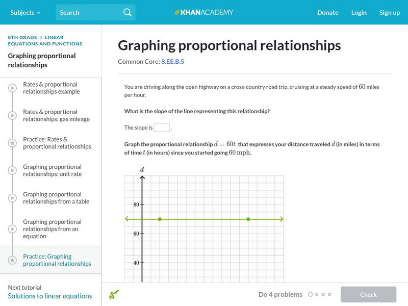 Practice reading and analyzing graphs of proportional relationships. Students receive immediate feedback and have the opportunity to try questions repeatedly, watch a video or receive hints.