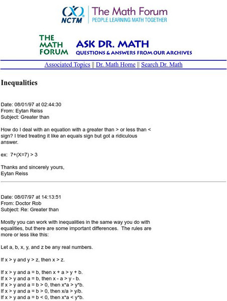 "Dr. Math" responds to a student question about solving inequalities. Within the response, a list of the properties of inequalities is provided. Site by Math Forum