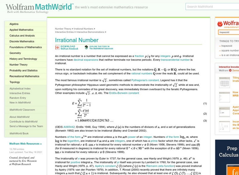 This math site explains what it means for a number to be irrational and names various persons who have proven the irrationality of some numbers, the site also gives several numbers who are thought to be irrational yet have not been...