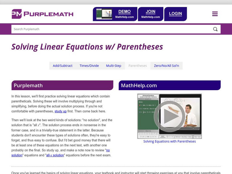 Purplemath: Solving Linear Equation With Parentheses; "No Solution" Equations