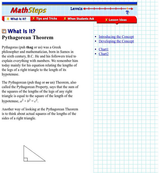 This is a great place for information on the Pythagorean Theorem. Three other sections (tabs at the top) are available, including tips, students' questions, and lesson ideas.