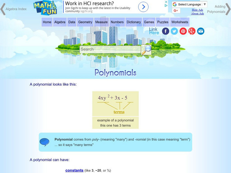 Students learn about polynomials in this mathematics resource. The resource explores types of polynomials, terminology, and examples.