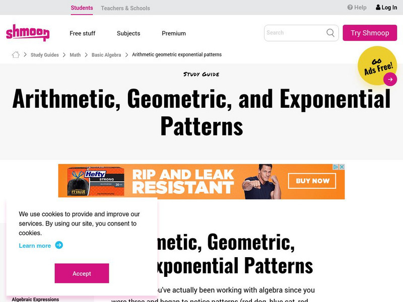 The algebra resource examines arithmetic, geometric, and exponential patterns. Students learn about the math concepts through notes, examples, and practice exercises.