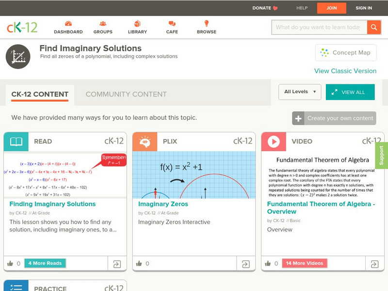 [Free Registration/Login may be required to access all resource tools.] This lesson shows you how to find any solution, including imaginary ones, to a polynomial. Students examine guided notes, review guided practice, watch instructional...